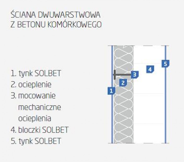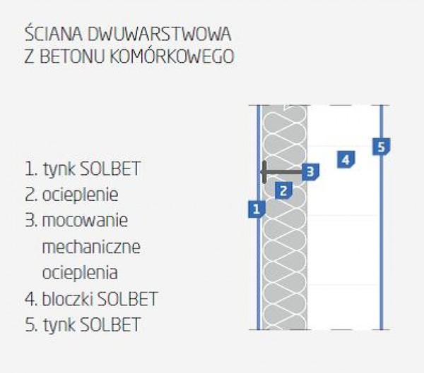Mur wzniesiony z bloczków SOLBET Optimal wymaga ocieplenia. Najczęściej stosowanym rozwiązaniem jest ocieplenie ścian zewnętrznych styropianem, metodą bezspoinową ETICS. w tym przypadku materiał izolacyjny mocuje się bezpośrednio do muru na zaprawę klejącą. Do mocowania styropianu do przegrody wykonanej z betonu komórkowego zaleca się użycie systemu SOLBET Termo. Jego głównym produktem jest klej do styropianu SOLBET Gabit Termo. Został on dopracowany pod kątem rodzaju podłoża, jakim jest beton komórkowy, a także rodzaju materiału izolacyjnego. Dzięki temu zapewnia m.in. odpowiednie wiązanie z podłożem, a więc trwałość i wytrzymałość wykonanego ocieplenia. Do ocieplenia ścian, oprócz kleju, wymagane jest także użycie kołków mocujących. Nie można też pominąć warstwy zbrojącej – siatki z włókna szklanego, która stanowi kolejny element systemu SOLBET Termo. Wtapia się ją w warstwę zaprawy układanej na ociepleniu. Zadaniem siatki, najprościej ujmując, jest zapobieganie pojawieniu się rys na wykończonej tynkiem ścianie.