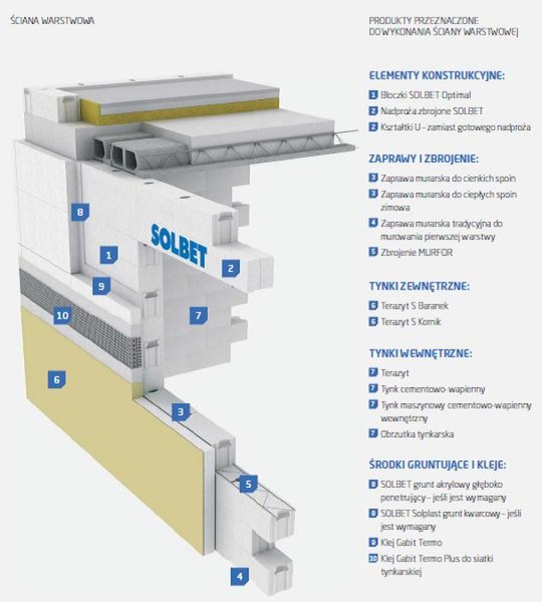 Niezależnie od rodzaju ściany elementy murowe SOLBET muruje się według tych samych zasad. Bloczki SOLBET Optimal produkowane są w wersji z piórami, wpustami i uchwytami oraz w wersji z obustronnymi wpustami i uchwytami. Decydując się na bloczki bez pióra konieczne jest konieczne jest wykonanie spoiny pionowej. Bloczki SOLBET Ideal charakteryzują się 1-milimetrową tolerancją wymiarową. Dzięki temu mogą być murowane na cienką spoinę. Do wnoszenie muru ściany warstwowej można też wykorzystać tradycyjną zaprawę. Wprawdzie nie zapewni ona tak dobrych parametrów izolacyjności termicznej przegrody jak zaprawa cienkowarstwowa, ale w przypadku ścian warstwowych nie jest to wymagane, gdyż mur i tak przykrywa warstwa ocieplenia. Do murowania bloczków zaleca się użycie zaprawy murarskiej SOLBET. Jej parametry zostały dobrane pod kątem materiału murowego. Do gotowej mieszanki wystarczy dodać wodę i starannie wymieszać. Przygotowanie zaprawy nie wymaga więc użycia betoniarki, co dodatkowo przyspiesza prace budowlane.